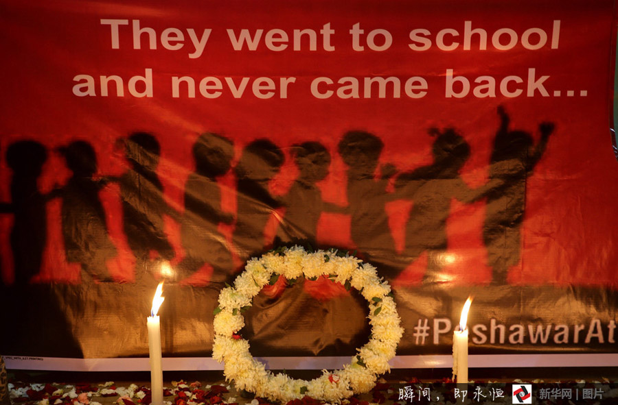 当地时间2014年12月17日,民众点蜡烛悼念白沙瓦学校惨案受害者。12月16日,在巴基斯坦西北部城市白沙瓦发生的军人子弟学校遇袭事件造成141人死亡,其中包括132名学生和9名教职工。