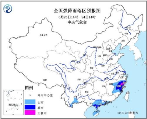 中新网6月23日电 据中央气象台消息,中央气象台6月23日10时继续发布暴雨蓝色预警,预计,6月23日14时至24日14时,浙江南部、福建中北部、广东西南部、广西东南部、海...