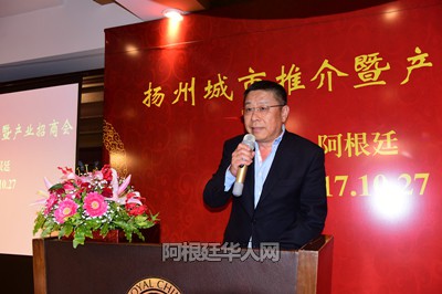 (阿根廷华人网10月28日讯 柳 军/文、图)昨晚,中国·扬州城市推介暨产业招商会在美丽的布宜诺斯艾利斯召开。阿根廷国家议员Ana Maria女士及阿根廷国家政界企业界代表、企业家代表,扬州市委常委、常务副市长陈杨及扬州市政府访阿代表团其他5名成员,中国驻阿根廷使馆陈志军领事,阿根廷中国和平统一促进会会长罗超西,阿根廷福清同乡会会长林文龙,阿根廷阿中投资贸易促进会会长何文强等侨团侨领,华商、华人代表近百人出席了活动。