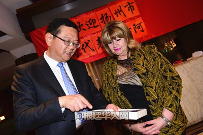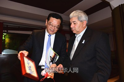 阿根廷福清同乡会会长林文龙与扬州市政府访阿代表团交换礼物。