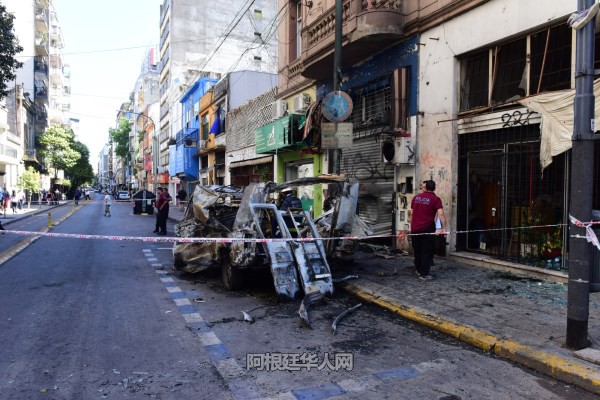 (阿根廷华人网12月14日讯 柳 军/文图)今天凌晨5时许,首都ONCE区Peron2200与Uriburu200交口处一汽车发生爆炸,有四人受伤被送往医院。附近的一店家铁门被炸变形,多家店铺玻璃被震碎,警方在现场调查事故原因。