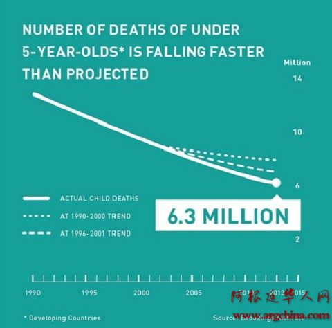 对我来说,衡量世界是都在进步的一大标准就是,看看有多少孩子死于可预防疾病。和以往相比,如今有更多的孩子能够活着度过他们的五岁生日。算起来,2014年至少是儿童死亡率下降的第42个年头。儿童死亡率比以往下降的更快,这无疑是个好兆头。