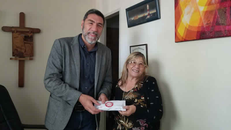 牧师 Marcelo Robles 和校长 Maria Alcira 接受捐赠