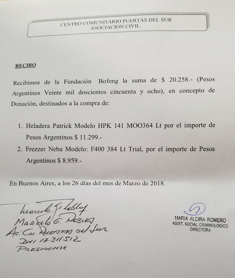 日前,阿根廷铂烽一心林海宁先生在调查了解长期捐助对象时得知,位于布市Bajo Flores区儿童之家用来储备食物的冰箱在几天前损坏,给生活在这里的孩子带来不便。林海宁先生与洪国益先生得知情况后,及时驱车前往儿童之家进行看望并了解基本情况。随后,铂烽一心慈善基金会与儿童之家均有长期合作意愿。作为首批应急专项捐赠,在收到儿童之家所需物资报价后,铂烽一心工作人员立即进行项目审核,并于今天上午安排人员前往儿童之家进行了捐赠。