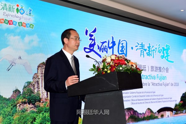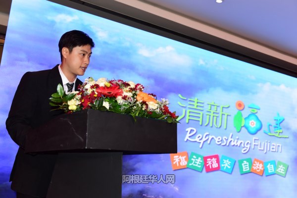 福建省旅发委副主任苏庆赐首先发表致辞,他说:“福建地处中国东南沿海,与中国台湾岛隔海相望,陆域面积12.4万平方公里,海域面积13.6万平方公里,总人口3千8百多万。福建是全国最大的侨乡之一,有1千5百80万海外乡亲。”