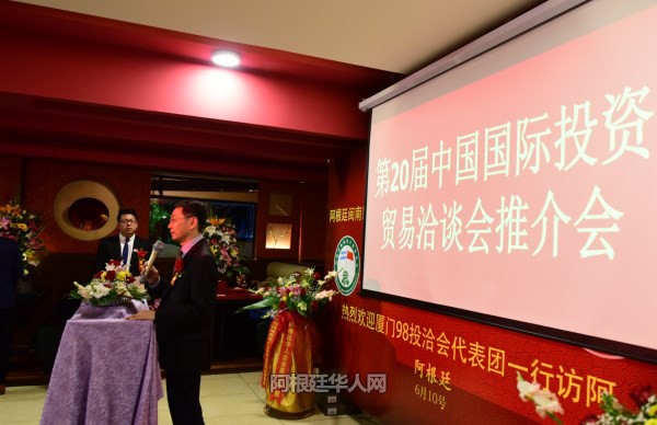 (阿根廷华人网6月11日讯 柳 军/文图)6月10日晚,第20届中国国际投资贸易洽谈会推介会在布宜诺斯艾利斯皇家大酒店召开。厦门98投洽会访阿代表团团长、厦门市人民政府外事侨务办公室党组成员、厦门市人民对外友好协会副会长孔速婷女士,中国驻阿使馆侨务领事陈志军,阿根廷中国和平统一促进会会长罗超西,阿根廷华人企业家协会主席严祥兴,阿根廷闽南工商企业联合会会长上官碧旺,旅阿侨团侨领,旅阿华人企业家代表参加了推介活动。