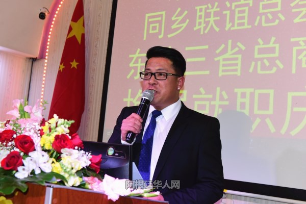 张金良继续表示:今天,我从郭长江会长手中接过重担,深感任重而道远。在此,我向大家承诺,在今后的会务工作中,我一定会竭尽全力,不负众望,带领旅阿东北籍同胞,在使领馆领导的支持和指导下,团结各兄弟侨团,为华侨华人争取更多的合法权益,积极融入当地社会,向当地社会展示华人的良好形象。