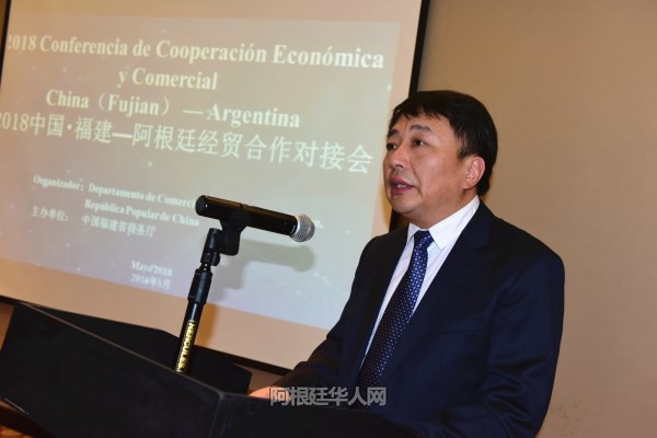福建省商务厅副厅长刘德培致辞中说:“福建省有良好的投资政策和环境,福建省是中国改革开放最发达地区之一。阿根廷是福建在拉美地区的重要经贸合作伙伴,2017年双边贸易额达6亿美元,其中福建出口4,7亿美元,进口1,3亿美元。至2017年底,阿根廷在福建投资58个企业,外方实际投资1,1亿美元;福建籍华侨华人在阿根廷投资设立超市超过一万家。”