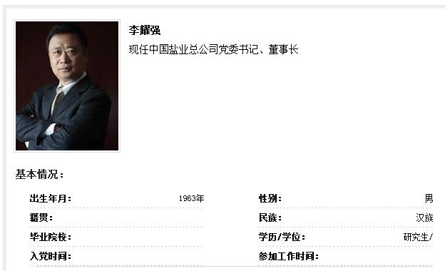 李耀强简历中国共产党新闻网北京10月14日电(崔小粟 黄琳) 据中国盐业总公司网站“管理团队”栏目显示,近日,李耀强任中国盐业总公司党委书记、董事长。李耀强同志简历李耀强,...