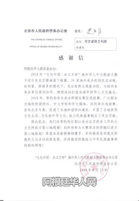 (阿根廷华人网8月30日讯 柳军/文)昨日,2018阿根廷“文化中国·水立方杯” 海外华人中文歌曲大赛承办单位阿根廷华文教育基金会,收到本次大赛组委会和北京市人民政府侨务办公室联合发来的感谢信。对阿根廷华文教育基金会在启动晚,时间紧,困难多的情况下,成功举办了阿根廷赛区的比赛给予好评和感谢。