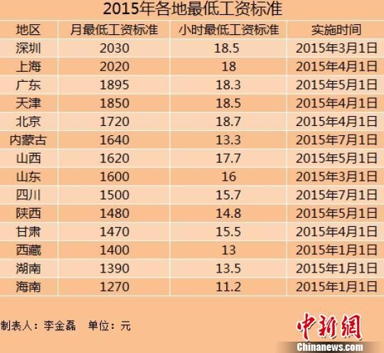 14地区2015年最低工资标准。 中新网北京7月3日电 (记者 李金磊) 进入7月份,四川、内蒙古均上调了最低工资标准。据中新网记者不完全统计,截至目前,全国至少已有1...