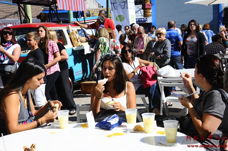 今天下午,在首都Chacarita区Concepcion Arenal 4800号附近,一种别出心裁的读书与美食节在这里进行。现场一排排书摊与一排排食品售货车在路边相呼应,市民在道路中间穿行,这边看看书,那边买一份美食,边吃边阅读忙得不亦乐乎,一些名人备受热捧,又拍照又签字也是忙得不可开交。
