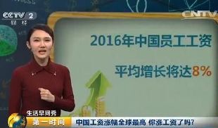 央视:中国员工工资将平均增长8% 增幅全球第一 国内新闻 • 2016-01-11 12:25• 收藏本文 cSb阿根廷华人网 央视截图 转载本网稿件,原则上需要书面授权,不得篡改稿件主题。本网随时有权要求第三方停止侵权行为。 本网所载内容或图片,若涉及侵权,请联系删除。 11 ___________ 2016/01 央视:中国员工工资将平均增长8% 增幅全球第一 央视截图 央视截图 央视截图 央视财经(《第一时间》)有一个好消息要告诉“恐归族”们的是,别担心,新的一年要涨工资啦! 研究报告显示,20... [ 微信长按识别二维码或扫码查看分享内容 ]
