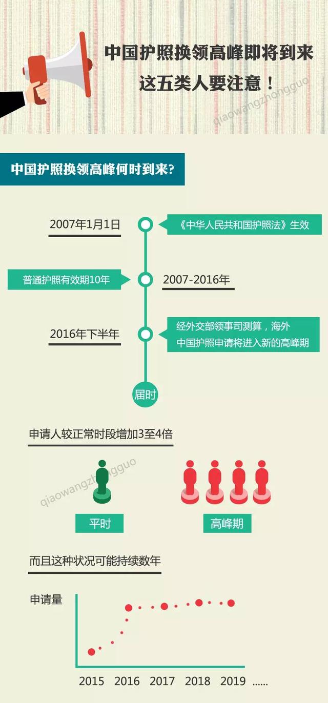2016年是《中华人民共和国护照法》正式生效的第十个年头,由于法律规定护照到期后不能再办理延期,因此可以预见,换领新护照即将成为很大一批人未来一段时间的重要任务。还不赶紧找出您的护照,看看是不是快到期了?如果有效期不足一年,中国侨网建议您最好尽快办理相关手续,避开高峰哟!