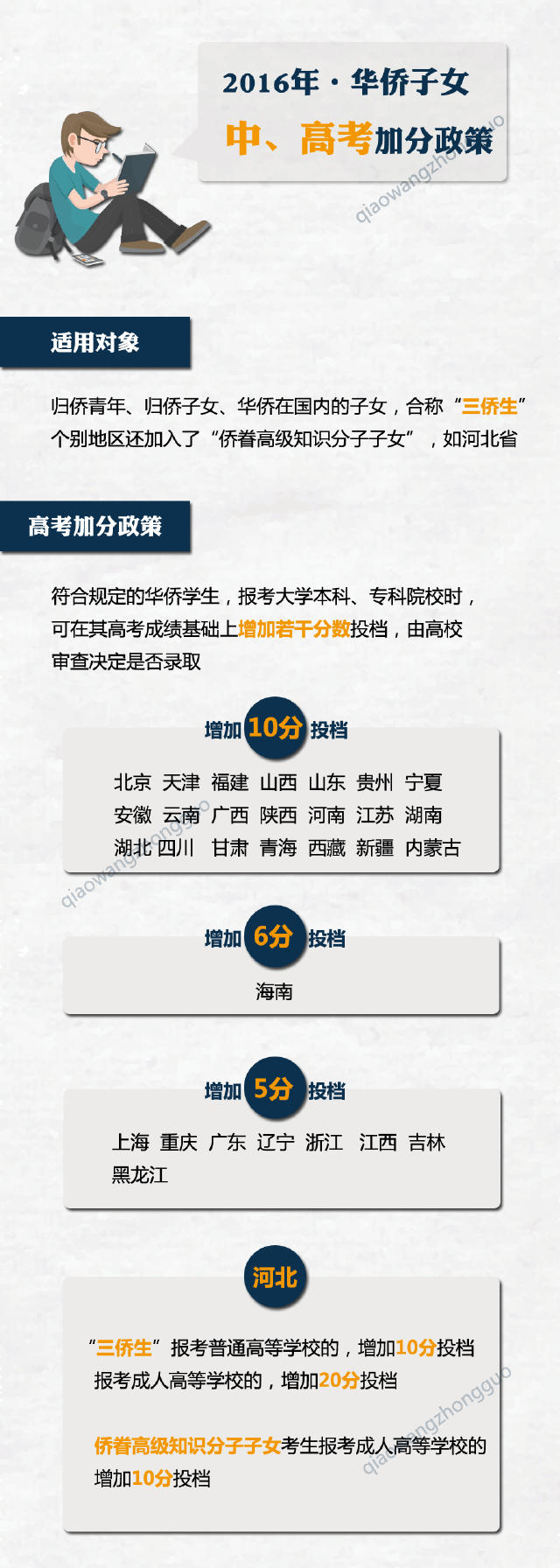 一直以来,中国对华侨子女回国读书、升学都有一系列的照顾政策,2016年也不例外。下面就请大家随小侨一起看一看,今年参加中、高考的华侨子女,都能享受哪些加分&照顾政策?