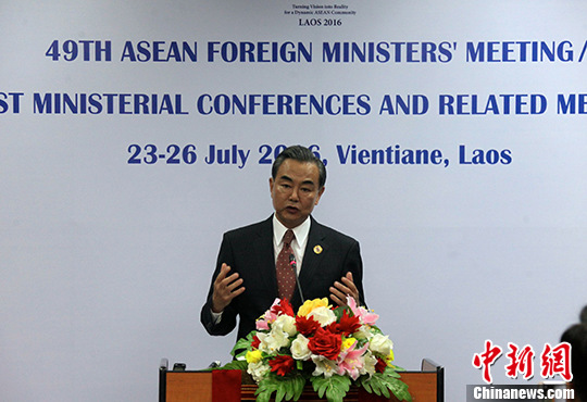 图为王毅在回答记者提问。 中新社记者 张明 摄 中新社万象7月25日电 (记者 张明) 中国外交部长王毅25日在老挝万象对媒体表示,当天发表的中国和东盟国家外交部...