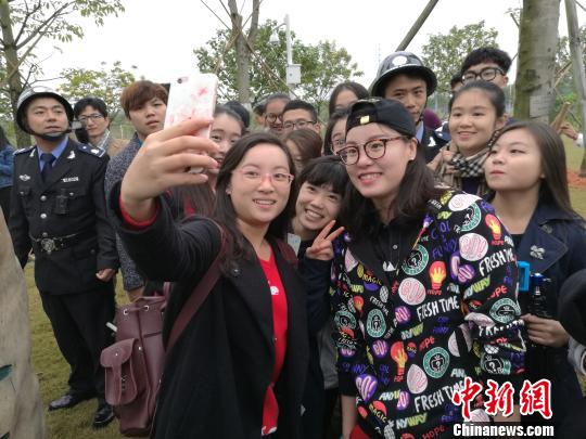 当日上午,吴敏霞、傅园慧一行刚一下车,就受到一群暨大学生粉丝的热情欢迎,大家纷纷上前请求合影留念。