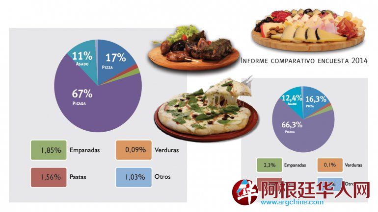 但是,这不是唯一的巧合。在这一天,选择吃什么对于阿根廷人来说也是十分重要的。传统的阿根廷烤肉成了人们的首选,再来一份由奶酪、火腿和橄榄等组成的餐前拼盘。据调查有67%的人选择了这个套餐。而去年的这项数据为63%。此外有17%的人选择了在这一天吃披萨。