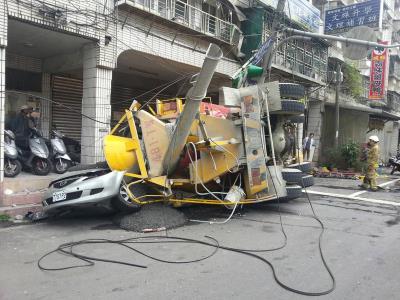 图片来源“中央社”中新网11月7日电 据台湾“中央社”报道,基隆市德安路今天上午发生混凝土预拌车翻覆事故,冲撞一辆银色小客车,及一辆议员宣传车。预拌车驾驶及宣传车驾驶到院前...