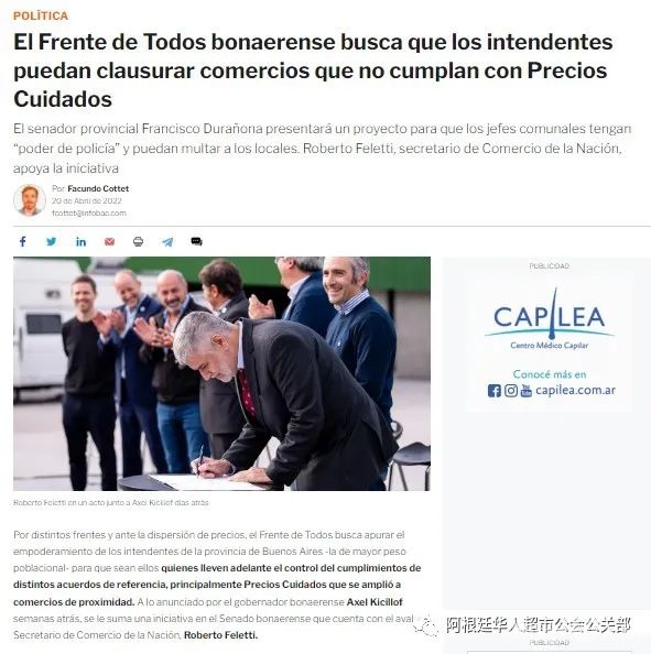 2022年4月20日,根据阿根廷INFOBAE媒体报道,面对国内物价的各种乱象,布宜诺省执政党(Frente de Todos)有意推动立法,让布宜诺省的市长有权查封地方上不遵守Precios Cuidados物价协议的商家。许多华人超市店主也在关切这个议题。华人超市公会公关部先初步梳理几个重点: