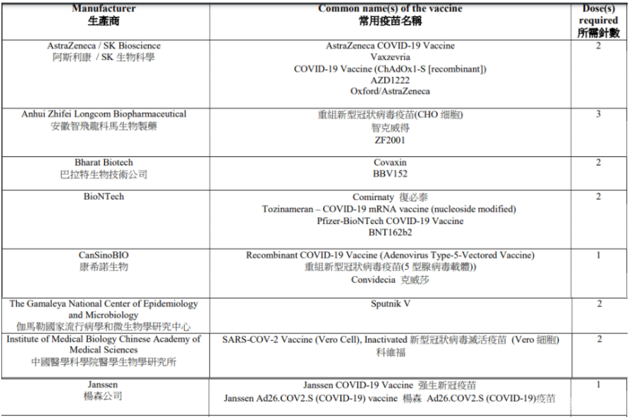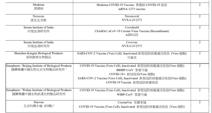 1、接种中国香港认可疫苗,提供疫苗接种证明