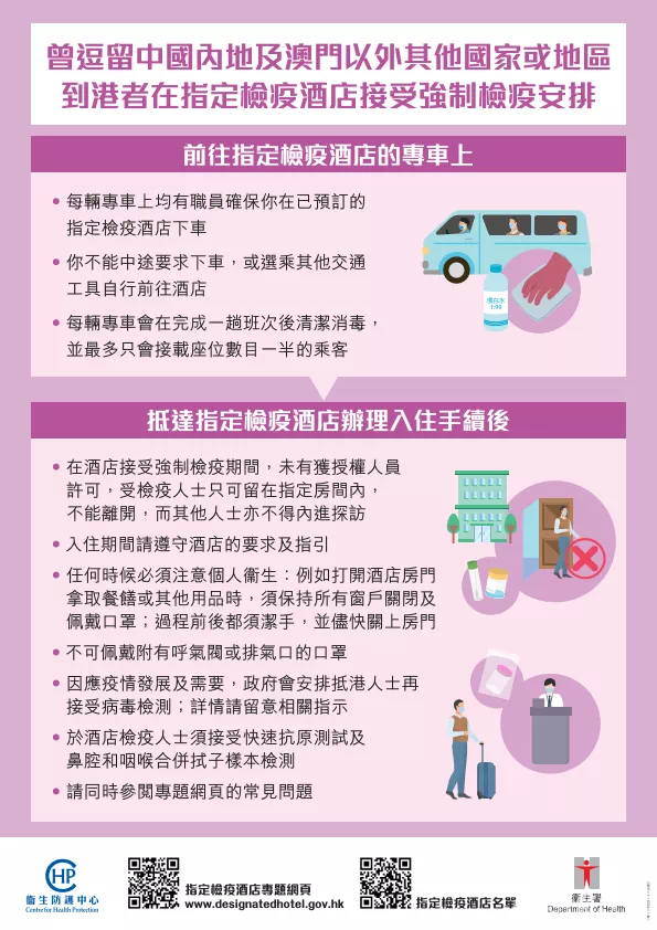 1. 仅持有中国护照者可通过免签停留香港7天,期间必须在指定检疫酒店隔离。 2. 隔离日期从抵港当晚计算。例如6.1入境,则6.1当晚开始计算,数7晚,即6.7当晚23:59解除隔离,6.8必须离开香港。 3. 隔离期满,可选择飞机、船,或者陆路交通离开。建议提前购买香港-内陆连续的票证。 4. 香港内地航班起飞前5-8H,在香港机场里做核酸需要提前预约,最早在出行前一周预约检测时段。 5. 回到内地需要根据当地隔离政策。 6.前往香港前需在落地前48小时内完成线上健康申报。 申报网站:https://www.chp.gov.hk/hdf/ 7.申请延长在港逗留期限 如因航班取消或未买到回程航班等紧急情况可像港府申请延长逗留期限,网址如下: 网上申请延长逗留期限(适用于访港旅客) | 入境事务处 办理时长一般为1个工作日,所需资料均需网上递交 8.深圳防疫驿站预约网址 健康驛站房間線上預約系統 *请仔细阅读注意事项,并承担相应风险,谨慎选择回国方案。了解更多请登录香港特别行政区政府官网 https://www.coronavirus.gov.hk/sim/designated-hotel.html 04 非香港居民在港免签停留时间 中国护照:7天;美国:90天;加拿大:90天; 日本:90天;新加坡:90天;泰国:30天; 英国:180天;澳大利亚:90天;法国:90天 05 境外旅客抵港流程