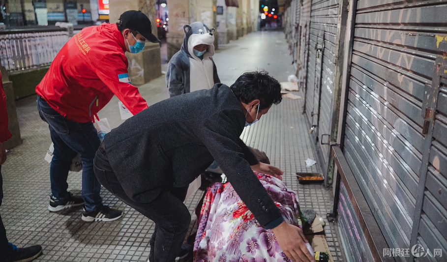 (阿根廷华人网6月19日讯Lisa)今年上半年,在阿根廷华人义工协会组织下,阿根廷侨界陆续十几次向当地慈善机构或贫民区捐赠了食品篮、大米、面条等粮食物资和防疫物资。近期阿根廷正值寒冬,阿根廷华人义工协会再次组织“寒冬送暖捐赠毛毯”活动,连续两天在深夜将毛毯捐赠给布市露宿街头贫困人员,因为旅阿华人的“雪中送炭”,让流落街头的当地民众在寒冷的冬夜泛起一股暖意。