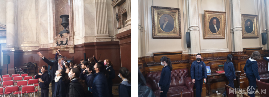 刚进入国会,学生们就被百年欧式建筑扑面而来年代感和厚重的故事所深深吸引。在老师和接待人员的带领下,通过中、西、英三语的介绍,学生们了解了国会的历史和各省及联邦特区参众两院席次。国会中的一幅幅画像,仿佛历史课本中的人物活灵活现地呈现在学生们面前。