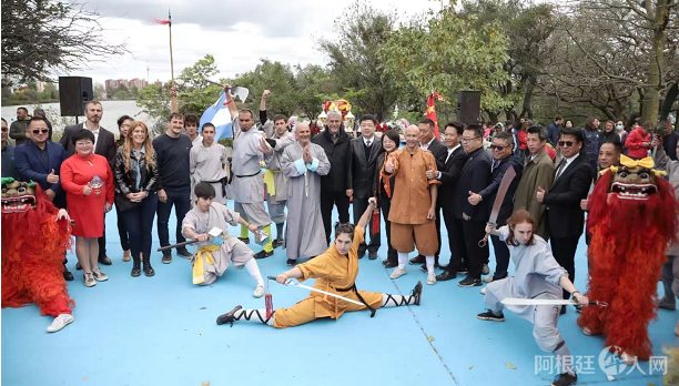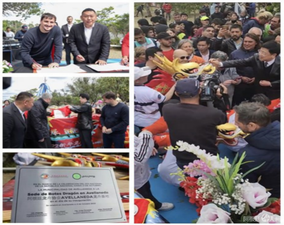 阿根廷龙舟协会会长刘金钢与阿韦亚内达市市长乔诺布洛夫签署了双方合作协议。邹大使与费拉莱西部长、乔诺布洛夫市长等嘉宾共同为阿韦亚内达市龙舟基地揭牌,并为参赛龙舟点睛。现场还举行了祈福仪式。阿根廷少林寺武术队展示了十八般武艺,精彩表演赢得观众阵阵喝彩。下午4时许,第一组龙舟整齐排列在起点线蓄势待发,邹大使与费拉莱西部长共同敲响铜锣,龙舟赛正式开始。