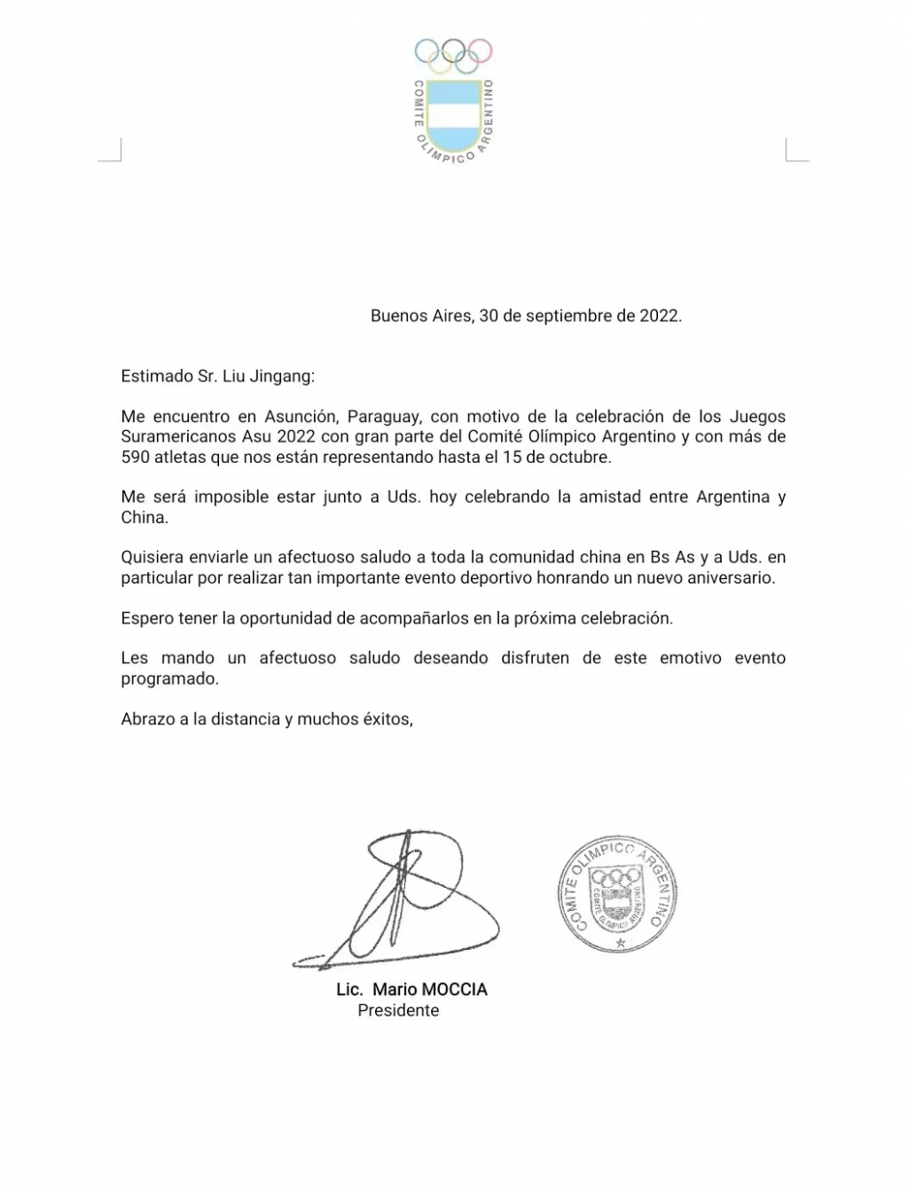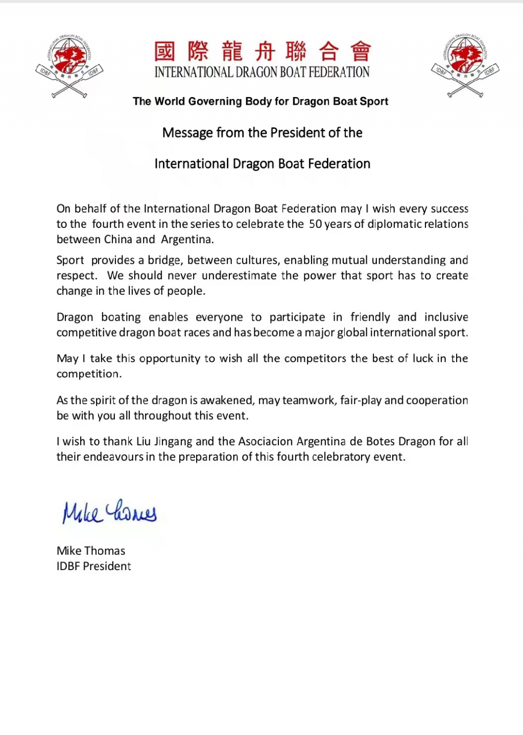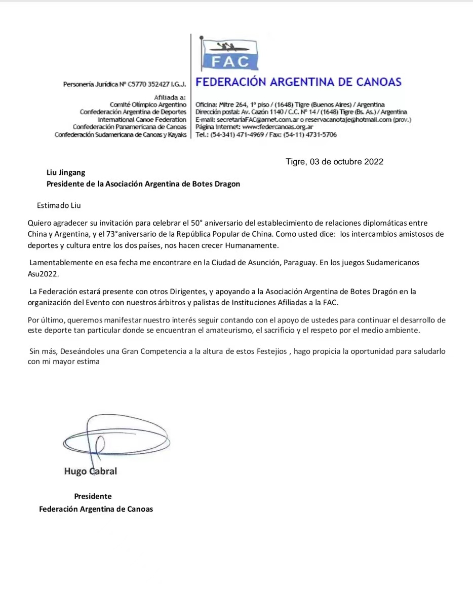 阿根廷奥林匹克委员会、阿根廷独木舟联合会和国际龙舟联合会发来贺信。