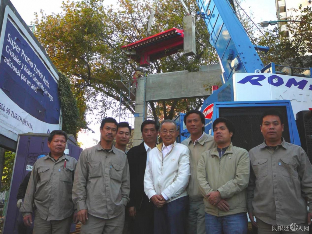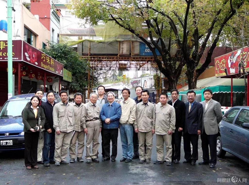 中国驻阿根廷大使馆十分关心中国城牌楼的建设。中国驻阿大使曾刚先生(中间)和夫人(右3),和设计师黄世春先生(左3)以及中方设计施工人员合影。