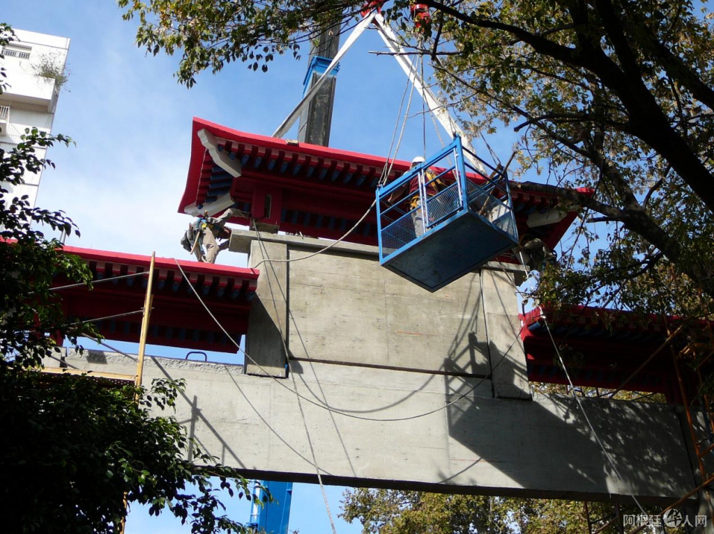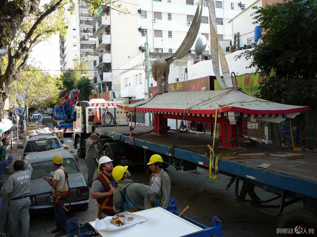中方设计师和技术人员一行五人,从晋江搭乘航班,经上海至德国法兰克福机场,转机后,于2009年4月28日飞机抵达阿根廷首都布宜诺斯艾利斯的。在福建定制的所有牌楼部件和建筑材料分装在五个集装箱中,在人员到达之前就运抵布市。 所有在中国加工的构件达32吨,由中国远洋集团有限公司免费海运。