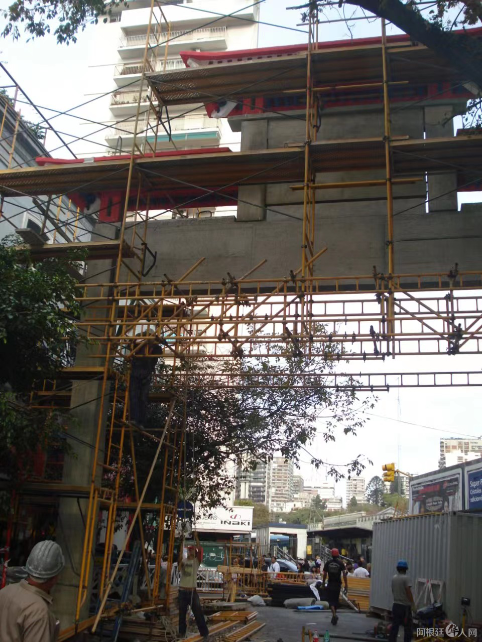 主构架阿根廷方设计师,建筑师米格尔.安格尔.比塔先生介绍说:主构架的处理法是桥梁建造式。构件衔接处用四根长40cm的钢筋插入预留的钢管中。施工使用的是建筑专用强力胶,建筑质量有保证。即便建筑寿命终结,而它都不会脱落。