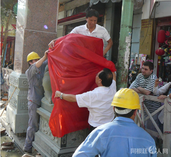 和统会会长袁建平和老华侨黄依太,为石狮披上红绸布,等待揭幕日期的到来。