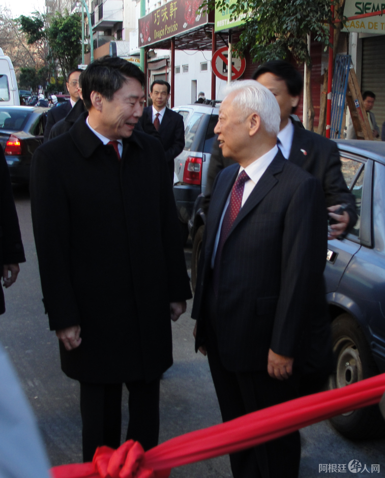 中国全国人大常委会副委员长、民革中央主席周铁农(右),和中国驻阿根廷使馆临时代办蔡维泉先生,在共同出席中国街牌楼的剪彩仪式。