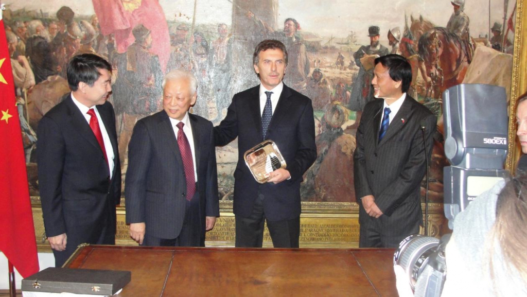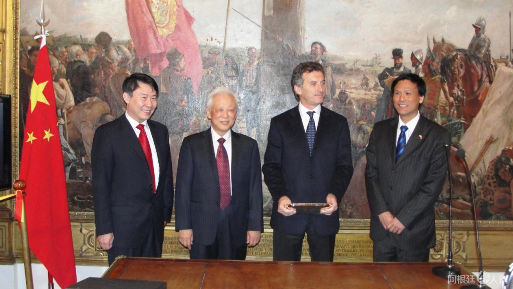 2009年7月8日,中国全国人大常委会副委员长、民革中央主席周铁农(左2),代表阿根廷华人社团将象征牌楼的银牌赠送给布市政府。 时任布宜诺斯艾利斯市市长马克里(右2)代表布市政府接受了赠送银牌。中国驻阿根廷使馆临时代办蔡维泉(左1)和阿根廷中国和平统一促进会会长袁建平(右1)出席了赠送仪式。