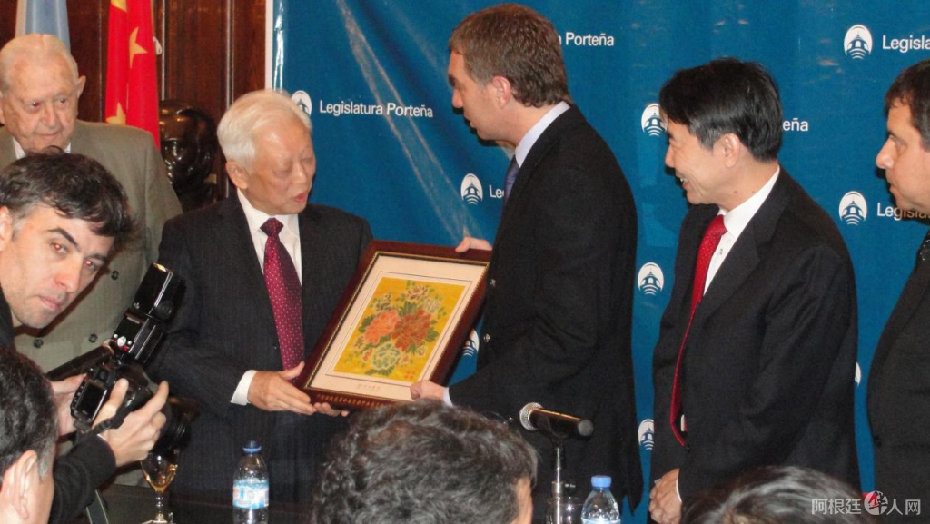2009年7月8日,中国全国人大常委会副委员长、民革中央主席周铁农(左2),代表阿根廷华人社团将象征牌楼的银牌赠送给布市政府。 周铁农在贵宾到访簿上签字留言:“从现在开始,这座牌楼属于布宜诺斯艾利斯市的人民。”