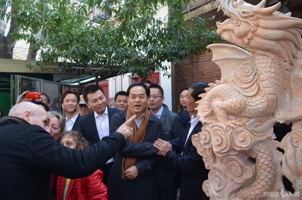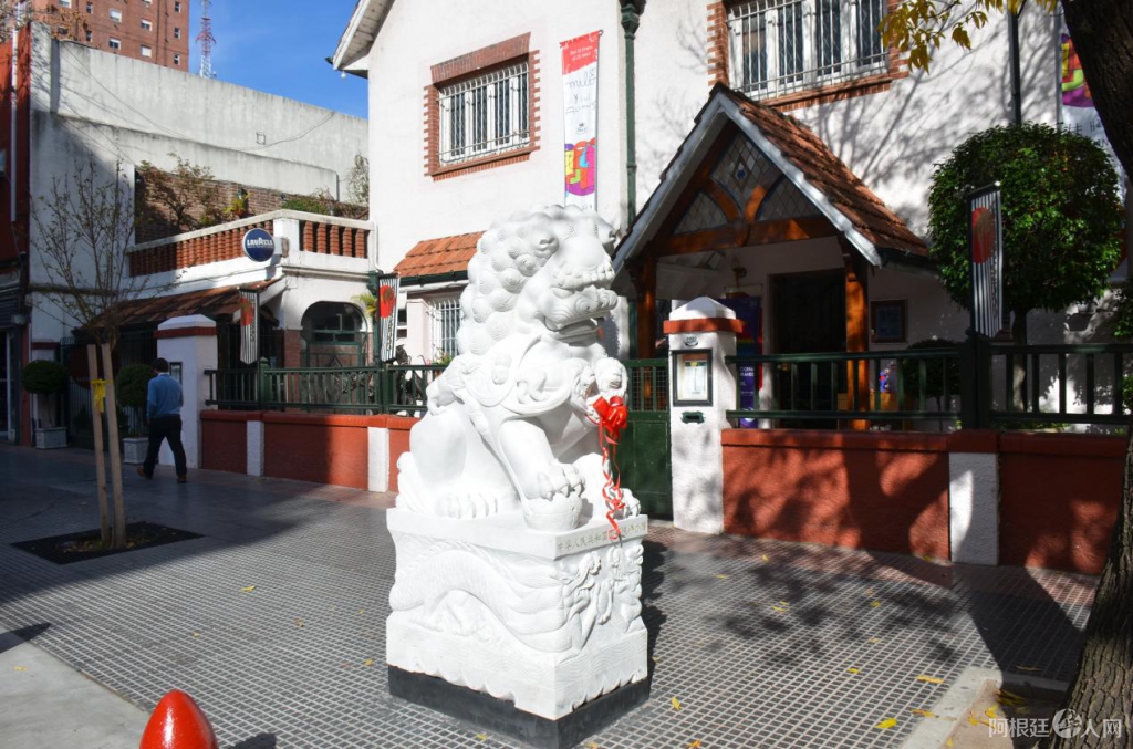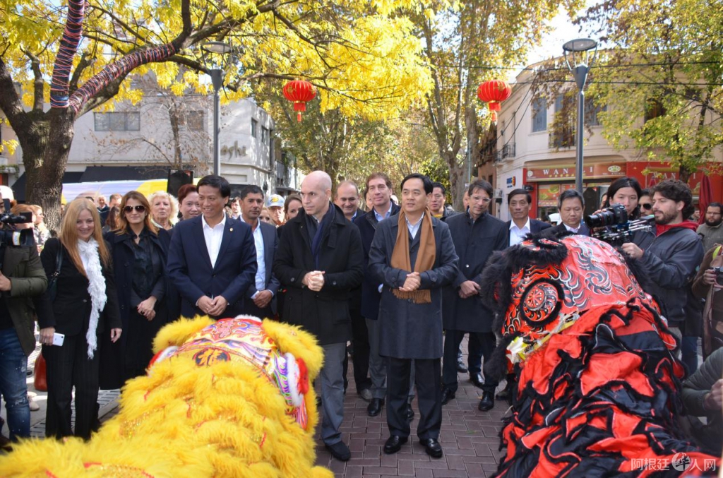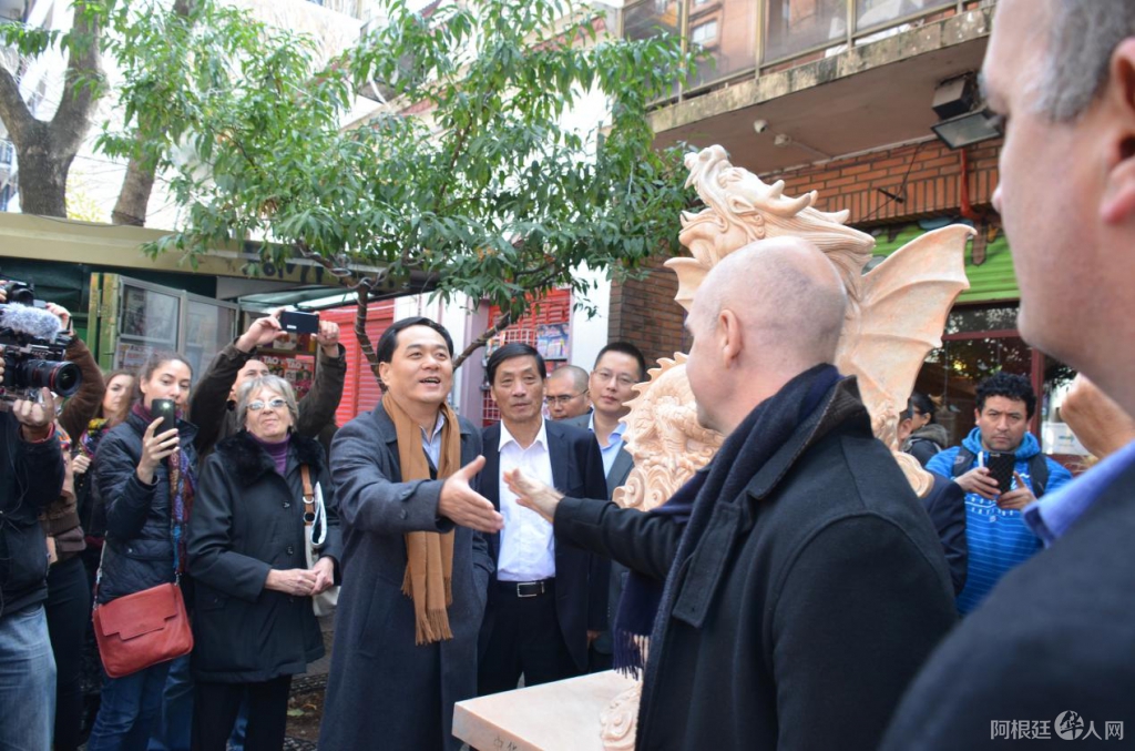 2016年5月11日,中国驻阿根廷大使馆杨万明(右2),布市市长奥拉西奥•罗德里格斯•拉列塔(左2),布市副市长Diego Santilli(右3)、布市华裔议员袁建平(左1)和中国城管委会会长王庆苍(右1),出席了中国国务院侨办赠送给布市中国城,一对石狮和飞龙雕塑的落成仪式。