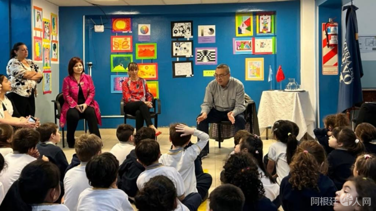 黄康益和王婧壬秘书还参观了新太阳学校的小学部及中学部,新太阳中方校长贾微女士介绍道:新太阳学校是阿根廷教育部注册的学历制学校,至今建校已经四十年余,十年前,新太阳学校在使馆及阿根廷华人侨团的支持下,建立了中文教学部,专门接收西文零基础中国学生,至今全校中国学生百余名,这给阿根廷当地学生的学习生活带来了更多彩的一面。新太阳学校与中国多所高校建立了战略合作伙伴关系,是暨南大学、华侨大学、北京华文学院阿根廷境内的招生办事处,每年都为国内大学甄选、输送优秀生源,到目前为止,先后百余名进入了暨南大学、华侨大学、浙江大学、武汉大学、南京大学、中山大学、中央财政学院等国内高等学府深造; 同时也与阿根廷多所中学以及国立、私立大学合作,为开展双向留学生交流活动和中阿文化交流活动架起了一座桥梁,近十年中培养了近七百五十名中、阿学生。黄康益秘书表示:除了这种讲故事的形式,还可以带孩子们动手制作粽子、月饼、剪纸等,让孩子们在动手的过程中去深入了解中华传统文化,使馆也会一如既往地支持学校工作,助力中华文化更好地在当地传播:王婧壬秘书也表示:新太阳的多元文化环境,让学生们接触到不同的习俗、信仰、语言、食物和宗教等,不仅有助于学生更好地融入当地社会,还能帮助他们深入地理解和欣赏不同文化背景下的价值观和观点。最后,Alejandra校长诚挚邀请黄康益和王婧壬秘书能在明年,新太阳学校一年一度的中华文化周期间再次来新太阳学校,再次为新太阳学生们带来惊喜…