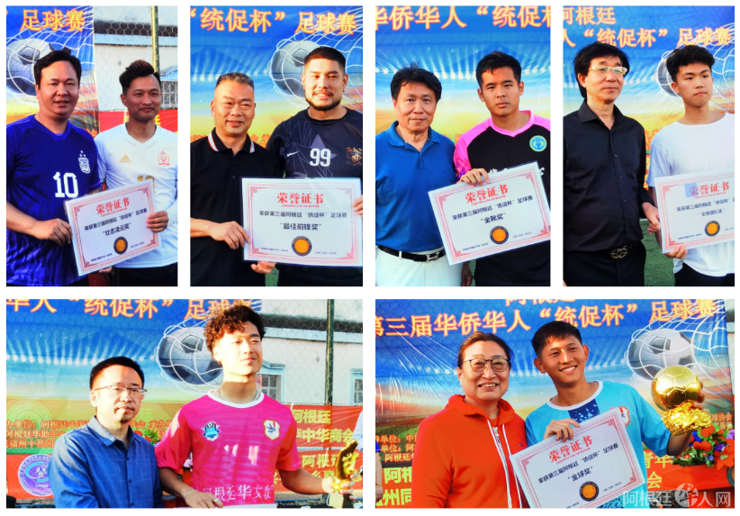 中国驻阿根廷使馆领导与旅阿侨团代表共同为各获奖团队及个人颁发了最佳守门员奖、最佳后卫奖、最佳前锋奖、金靴奖、金球奖、最佳文明团队奖、壮志凌云奖、季军奖、亚军奖、冠军奖、最佳贡献奖等奖项,为本届赛事画上圆满句号。