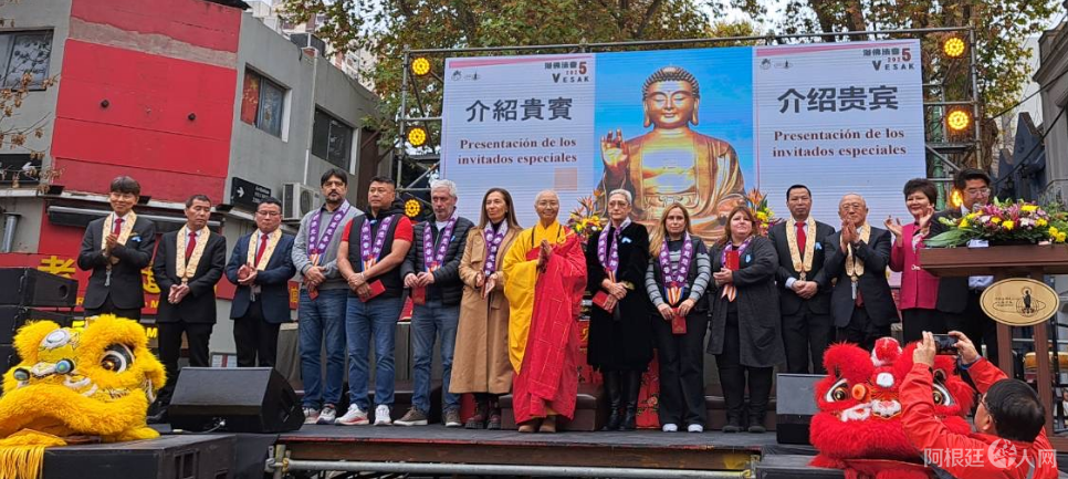 舞龙舞狮点睛仪式为法会拉开序幕。布宜诺斯艾利斯 13 区区长 Florencia Scavino 亲临现场,感谢佛光山将意义深远的节日带到中国城。当天恰逢佛诞与阿根廷国庆,她深感能与大家一同庆祝的荣幸,并希望这份喜悦能传遍整个社会。布市宗教事务总局长发来贺函,称赞佛光山推广慈悲、智慧与和平的普世价值,在促进文化多元与社会和谐方面堪称典范,承诺持续支持宗教团体为构建包容社会努力。