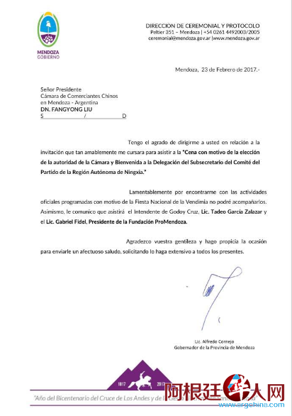 商会动态 • 2017-02-27 18:33• 在门多萨中华商会换届庆典之际,门多萨省省长ALFREDO CORNEJO发来贺电,并派出南美共市议会Gabriel Fid...