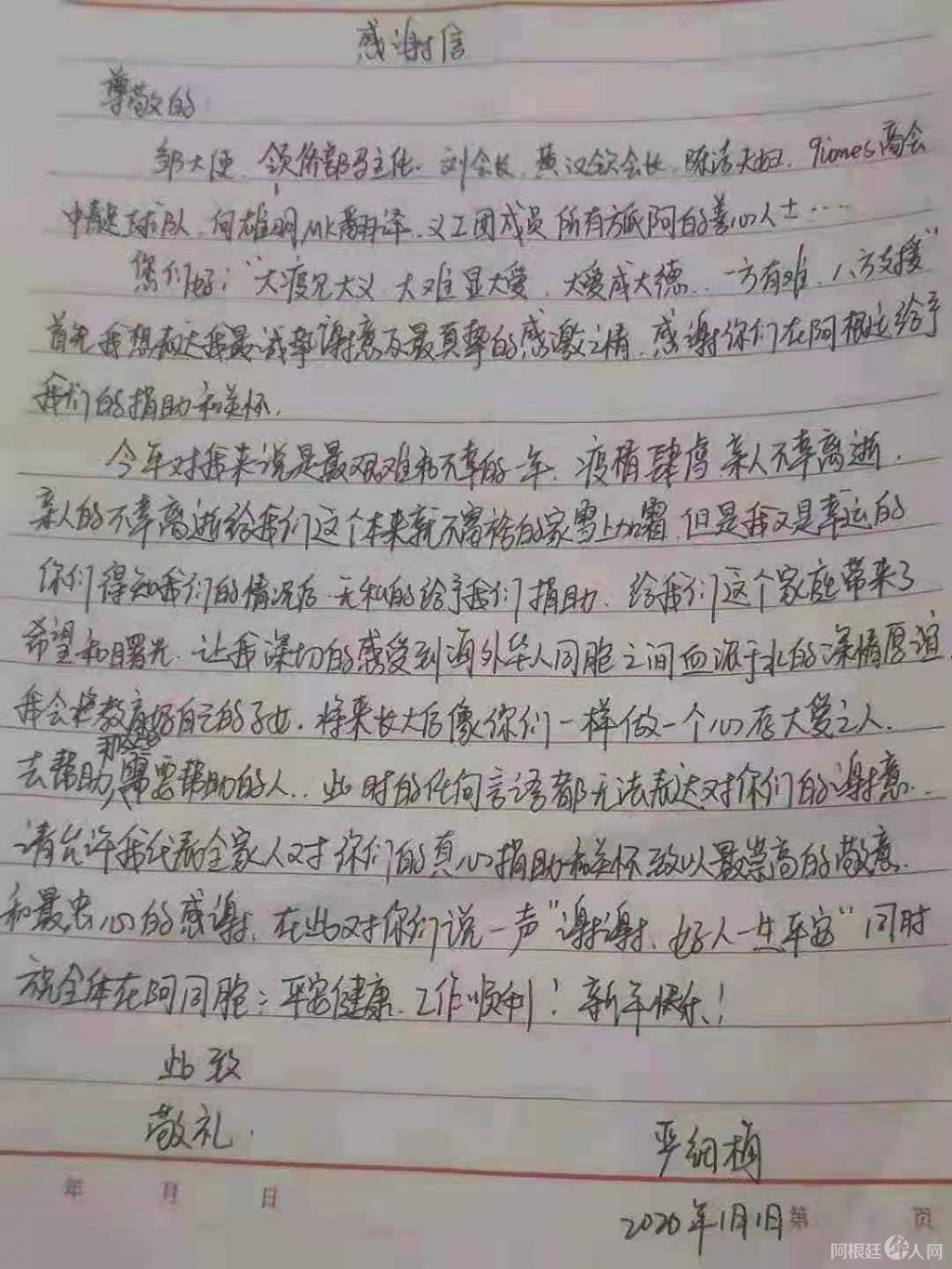 受助侨胞写给旅阿各界爱心人士的一封感谢信 阿根廷华人义工团队 • 2021-01-03 12:51• 收藏本文 转载本网稿件,原则上需要书面授权,不得篡改稿件主题。本网随时有权要求第三方停止侵权行为。 本网所载内容或图片,若涉及侵权,请联系删除。 03 ___________ 2021/01 受助侨胞写给旅阿各界爱心人士的一封感谢信 尊敬的邹大使侨领处马主任刘芳勇会长、黄汉钦会长、陈洁夫妇、QUILMES商会、中青足球队、何雄明、MK翻译、义工团队成员、所有旅阿的善心人士......... ... [ 微信长按识别二维码或扫码查看分享内容 ]