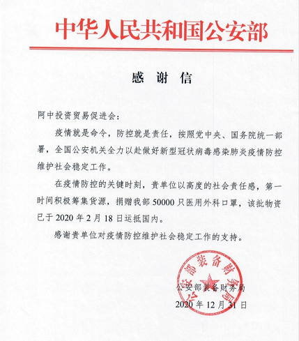 阿中投资贸易促进会收到中华人民共和国公安部感谢信 阿中投资贸易促进会 • 2021-01-06 20:45• 收藏本文 转载本网稿件,原则上需要书面授权,不得篡改稿件主题。本网随时有权要求第三方停止侵权行为。 本网所载内容或图片,若涉及侵权,请联系删除。 06 ___________ 2021/01 阿中投资贸易促进会收到中华人民共和国公安部感谢信 感谢信阿中投资贸易促进会:疫情就是命令,防控就是责任,按照党中央,国务院统一部署,全国公安机关全力以赴做好新型冠状病毒感染肺炎疫情防控维护社会稳定 工作。 在疫情防控的关键... [ 微信长按识别二维码或扫码查看分享内容 ]