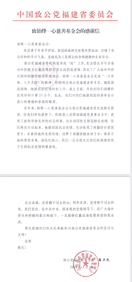 中国致公党福建省委与福建省红十字会致铂烽一心慈善基金会的感谢信 铂烽一心慈善基金 • 2021-02-08 12:22• 收藏本文 转载本网稿件,原则上需要书面授权,不得篡改稿件主题。本网随时有权要求第三方停止侵权行为。 本网所载内容或图片,若涉及侵权,请联系删除。 08 ___________ 2021/02 中国致公党福建省委与福建省红十字会致铂烽一心慈善基金 在新年来临之际,中国致公党福建省委与福建省红十字会给铂烽一心慈善基金会发来感谢信。铂峰一心慈善基金会发扬“一方有难,八方支援”的精神,共捐赠23万个医用外科口罩驰援祖国抗疫... [ 微信长按识别二维码或扫码查看分享内容 ]