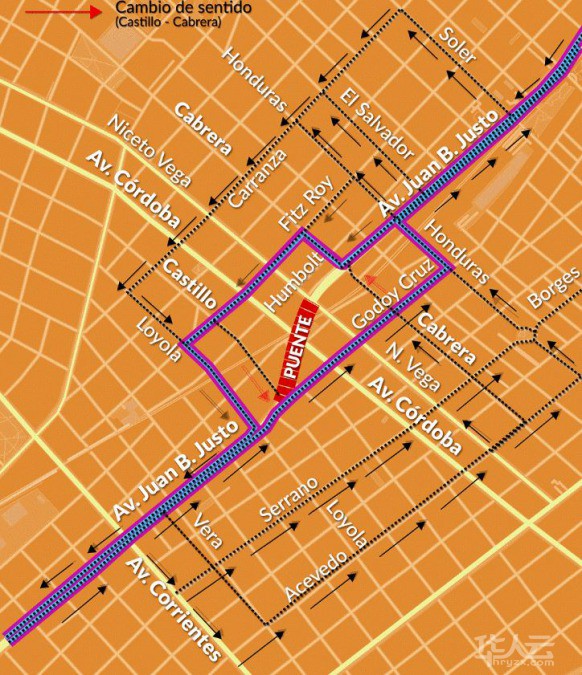 往东北方向: Av. Juan B. Justo, 右转到Padilla, avenida Corrientes, Vera 或 Loyola 往Serrano/Borges或 Acevedo/Armenia街道行驶后重新回到Juan B. Justo大街。