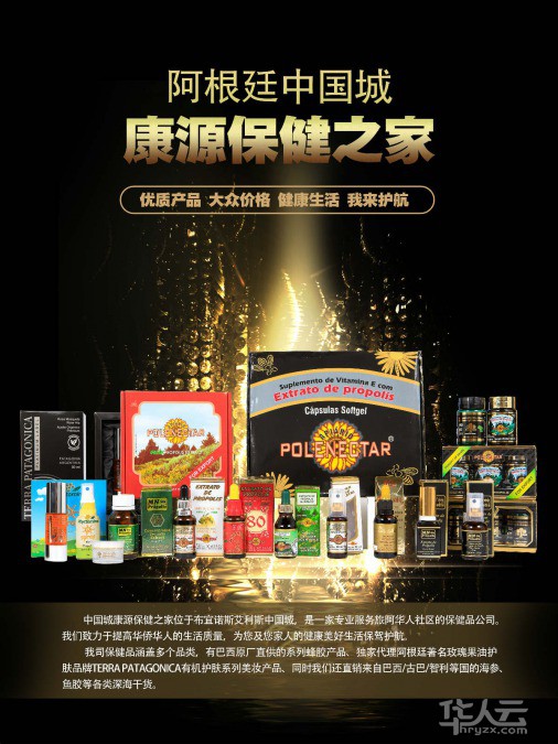 中国城康源保健之家位于布宜诺斯艾利斯中国城,是一家专业服务旅阿华人社区的保健品公司。致力于提高华侨华人的生活质量,为您及您家人的健康美好生活保驾护航。经营保健品涵盖多个品类,有巴西原厂直供的系列蜂胶产品、独家代理阿根廷著名玫瑰果油护肤品牌Terra Patagonica有机护肤系列美妆产品、同时还直销来自巴西/古巴/智利等各国的海参、鱼胶等各类深海干货。