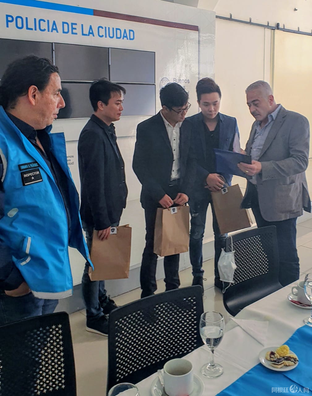 得知此情况后,阿根廷浙江联合总会谷建龙会长特别重视,马上要求总会骨干成员紧急筹集口罩、酒精等防疫物资,并于今早将这批应急物资及时运抵阿根廷布宜诺斯艾利斯市警察总局。总局局长Gabiel Oscar Berard 亲自进行了接待并召开座谈会。