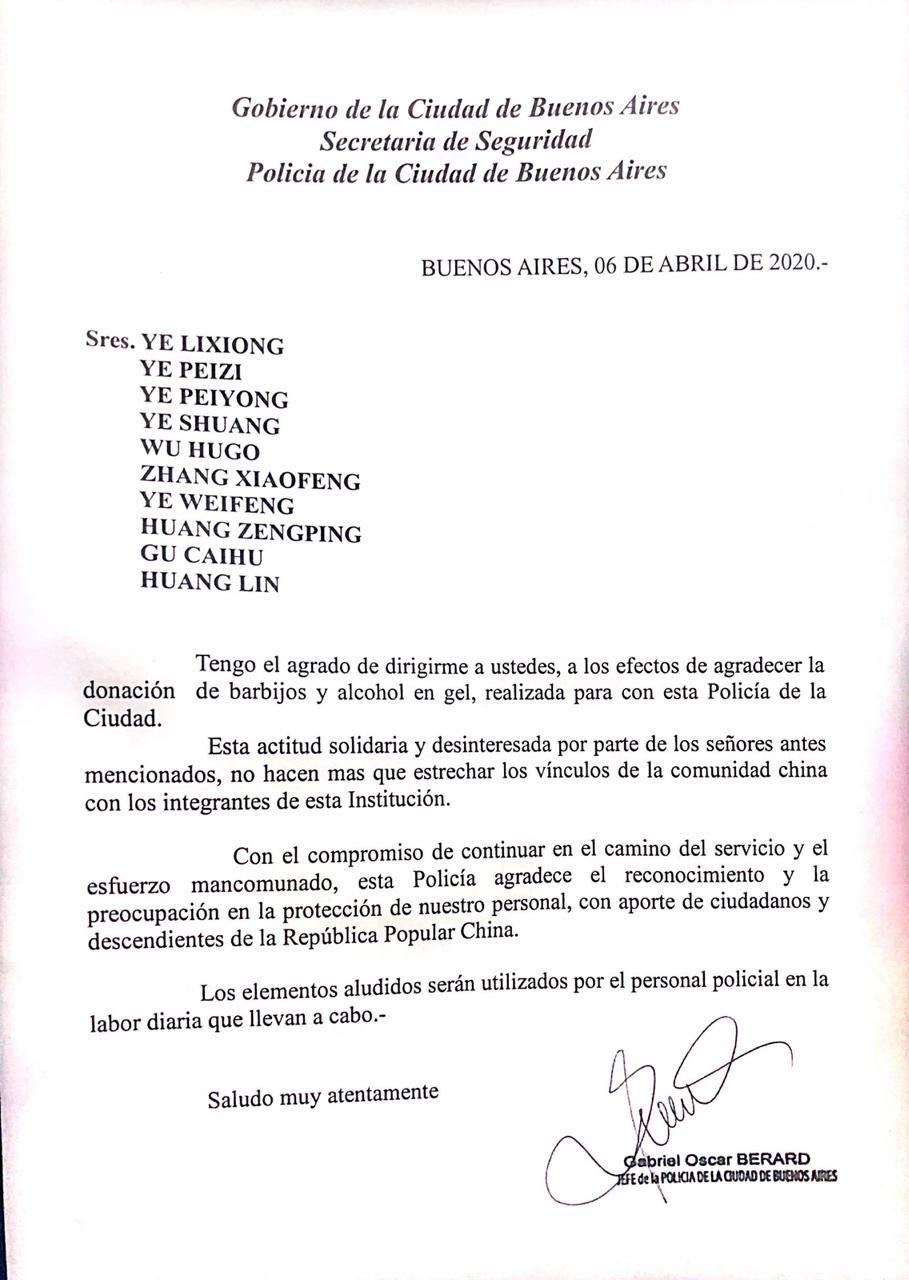 (阿根廷华人网4月6日讯 朱莉报道)截至阿根廷当地时间4月6日,根据阿根廷卫生部通报,阿根廷新冠肺炎确诊病例已累计1554例,死亡病例累计48例。在各地区中,首都布宜诺斯艾利斯的确诊病例数量最多,达到437例。然而,新冠病毒肺炎疫情仍在延续,而在疫情防控阶段,不断保障阿根廷社会秩序以及人们财产安全的警务人员各类防护物资告急,口罩、酒精等实际物资极度不足,疫情的发展、物资的短缺牵动着旅阿侨胞的心。