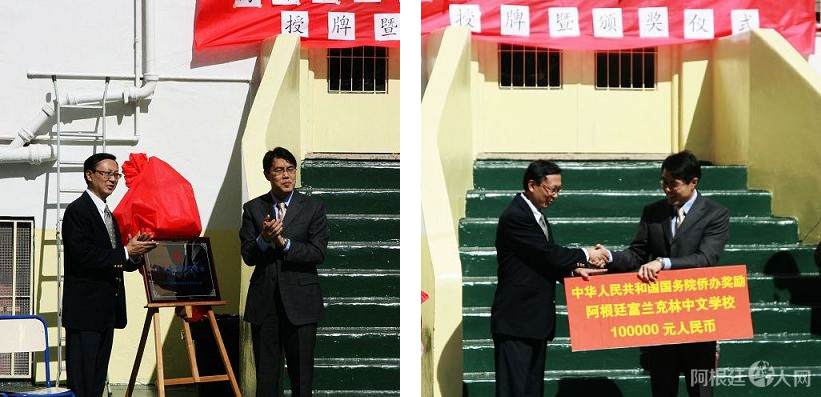 驻阿根廷使馆临时代办朱京阳出席“富兰克林中文学校荣膺国务院侨办海外华文教育示范学校授牌暨颁奖仪式”。全校师生约400人参加仪式。朱代办与毛亦丰校长共同为国务院侨办授予该校的“海外华文示范学校”牌匾揭牌,并向毛校长转交国务院侨办现金奖励10万元人民币。朱充分肯定该校多年来致力于推广华文教育取得的显著成绩并鼓励孩子们学好中文。
